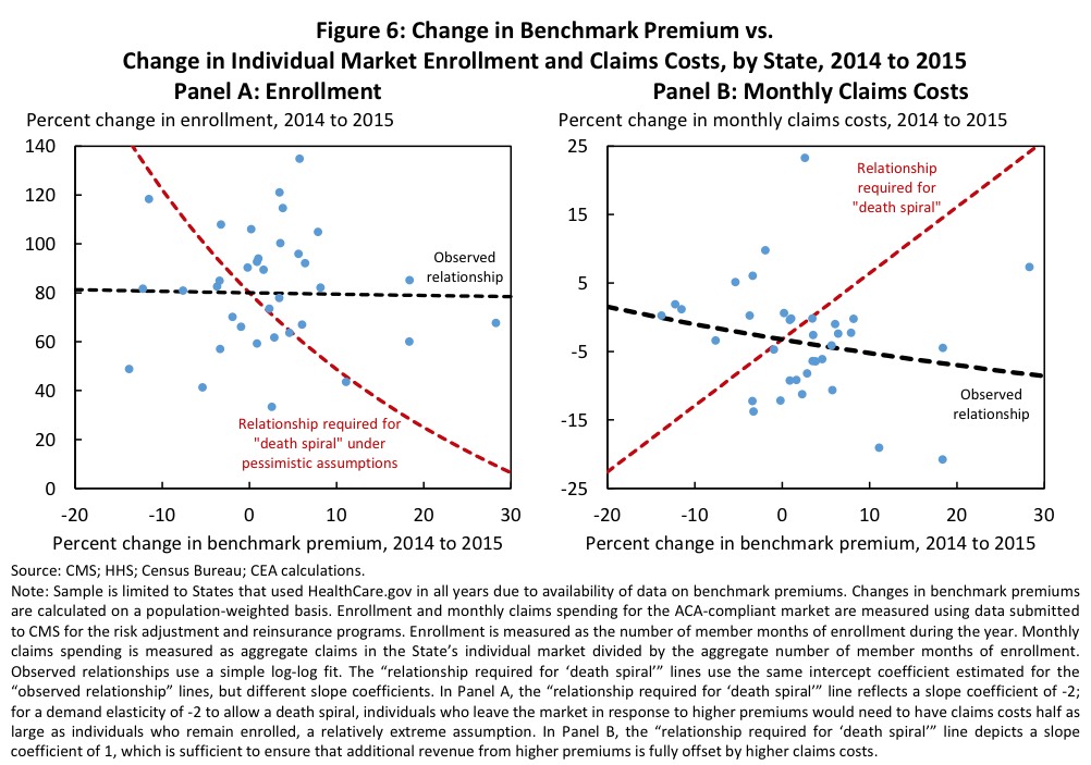 ...As shown by the black dashed line, there was essentially no relationship between premium changes and sign-up changes, which implies that premium changes had little or no effect on sign-ups. By contrast, for the individual market to have faced a death spiral, premium increases would have needed to cause large reductions in enrollment, akin to the relationship depicted by the red dashed line.