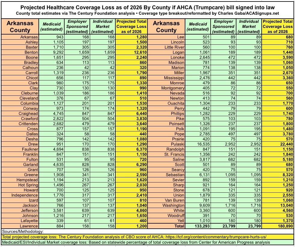 With that in mind, here's the County Level breakout of the Century Foundation's projections of how many people would lose healthcare coverage by 2026 under the GOP's AHCA bill. The yellow columns (Total) come directly from TCF's analysis; the green columns (type of coverage loss) are my own proportional estimates within those totals.