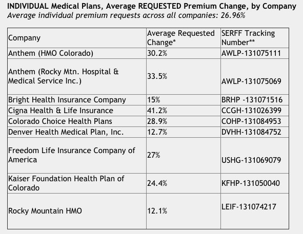 All of the insurance companies have requested premium increases for their plans in the individual market for 2018. For individual plans, the average premium request across all companies is 26.96 percent. In the small group market, the average premium request across all companies is smaller, 7.46 percent. These are averages across all of the plans a company is offering, across all areas of the state where a company offers plans, and for all ages. These do not represent how one person’s premium could change.“Remember that these are only what the companies have requested and are not the final premiums,” noted Commissioner Salazar “The companies must justify their premiums to the Division of Insurance, and our staff will review those justifications over the summer.