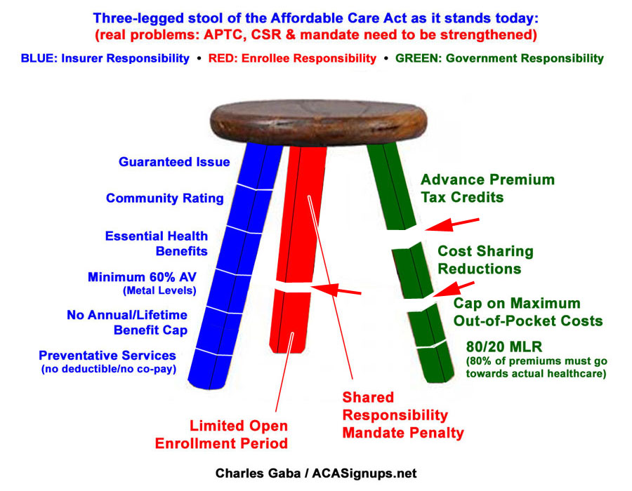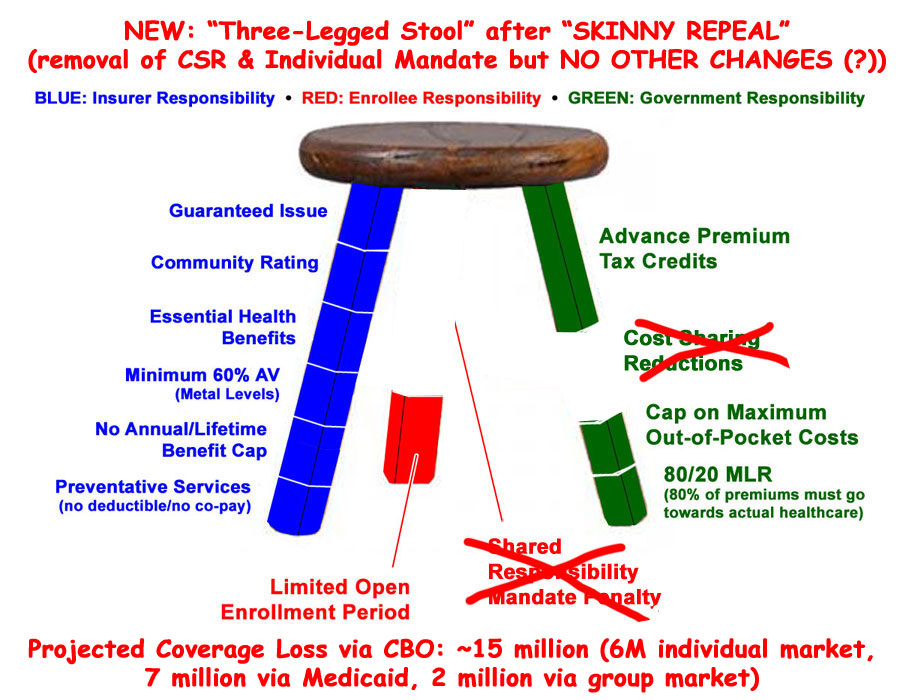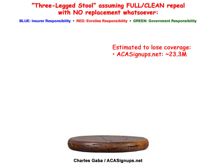 Here's what it actually looks like for a variety of reasons, including both legitimate glitches in the ACA itself as well as a whole lot of flat-out sabotage by the GOP over the past 7 years. While there are plenty of other issues which need to be addressed, the most obvious ones are that the tax credits need to be beefed up and applied to enrollees over the 400% FPL threshold, and the mandate penalty should really be increased. In short, two legs of the stool need to be lengthened...to continue the metaphor, we need a couple of shims. Around $12 billion per year or so should do the trick on the tax credit side. As it happens, one of the few useful parts of most of the GOP plans is that they do include a good $120 billion or so in "reinsurance/stabilization" funding over 10 years...which, in practice, would amount to about the same thing. The key is that this funding would have to be added to the existing ACA funding, not replacing it, which is what these plans do instead: