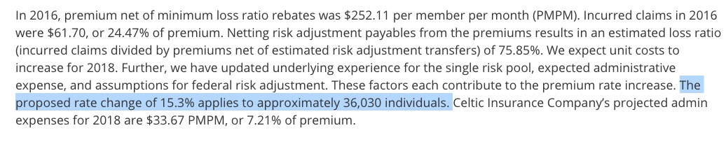 For instance in Illinois, Kaiser estimates that carriers would have to raise rates by 14% on Silver plans to cover their CSR losses. However, only 64% of Illinois exchange enrollees have silver plans to begin with, so I'm only plugging in about 9%. There are 5 carriers operating on the Illinois individual market (well, really 4, since "Freedom Life" doesn't count). I have the hard enrollment numbers for 4 of the 5; for Health Alliance Medical Plans I used 30,000 based on their 2016 number. Overall, Illinois is looking at around 11.3% w/partial sabotage, 20.3% with full sabotage: