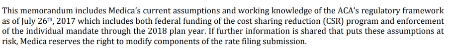 Interestingly, while Medica's rate filing letter clearly states that the 16.9% request assumes CSR payments will be made and the mandate will be enforced, they also list "unprecedented uncertainty/risk inherent in the marketplace" as one of the key drivers of the increase.