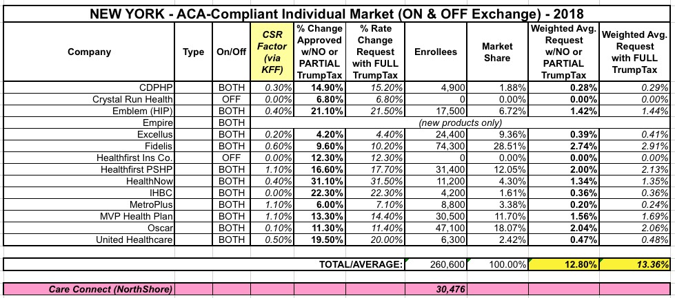 According to the state DFS, total individual market enrollment in New York is around 349,000 people, and CareConnect holds about 9.1% of them (the official number in the article is 30,476, or 8.7%, so there's a small discrepancy there). CareConnect also happened to be approved for one of the higher rate increases prior to their announcement: 23.5% on average. By removing them from the equation completely, the statewide average rate increase actually drops by another 1.1 percentage points, to 13.4%. Of course, that also means over 30,000 current enrollees will have to shop around for another carrier this fall...