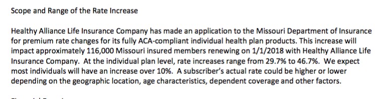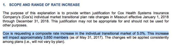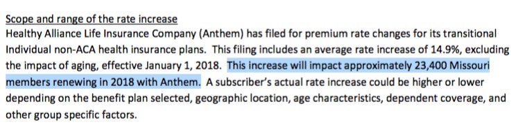 Normally I'd be pretty irritated by this, but to be honest, given what an utter mess the 2018 individual market landscape is shaping up to be, I can kind of understand this; the situation is even more fluid/confusing than ever, so I guess they figured there wasn't much point in posting the rate requests earlier than necessary if they're likely to change a dozen times before being locked in anyway. In any event, today the Missouri insurance department finally posted MO's requested rate changes for next year. This is kind of a big deal for the Show Me state, because until now, they were the only state in the country which didn't allow their own insurance commissioner to review rate hike requests.