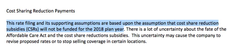 As for the CSR reimbursement issue: Again, only 3 of the carriers would be impacted by this, and one of those (Celtic) is new to the state and therefore has no previous premium average to compare against. This leaves Cigna and Healthy Alliance...both of which explicitly state that their requests assume CSRs will NOT be paid next year. The Kaiser Family Foundation estimates that CSR non-payment will add 18% to Missouri Silver plans, which translates into around 12.2% extra if spread across all policies.