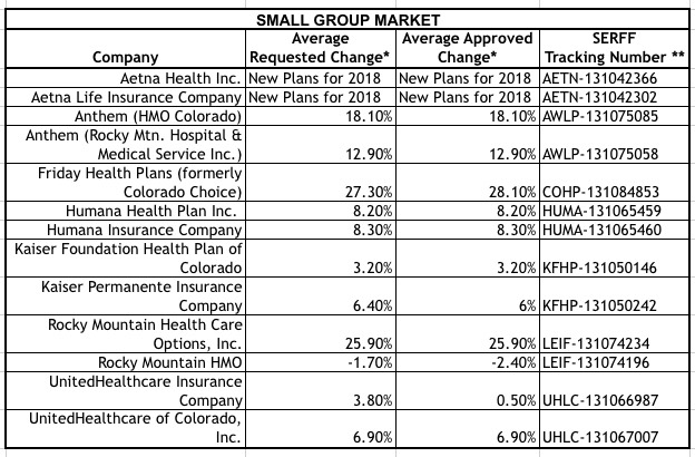 DENVER (Sept. 6, 2017) – The Colorado Division of Insurance (DOI), part of the Department of Regulatory Agencies (DORA), has approved the individual and small group health insurance plans for 2018. Average premium changes within each market - individual and small group - as well as the average change for each insurance company are listed below.