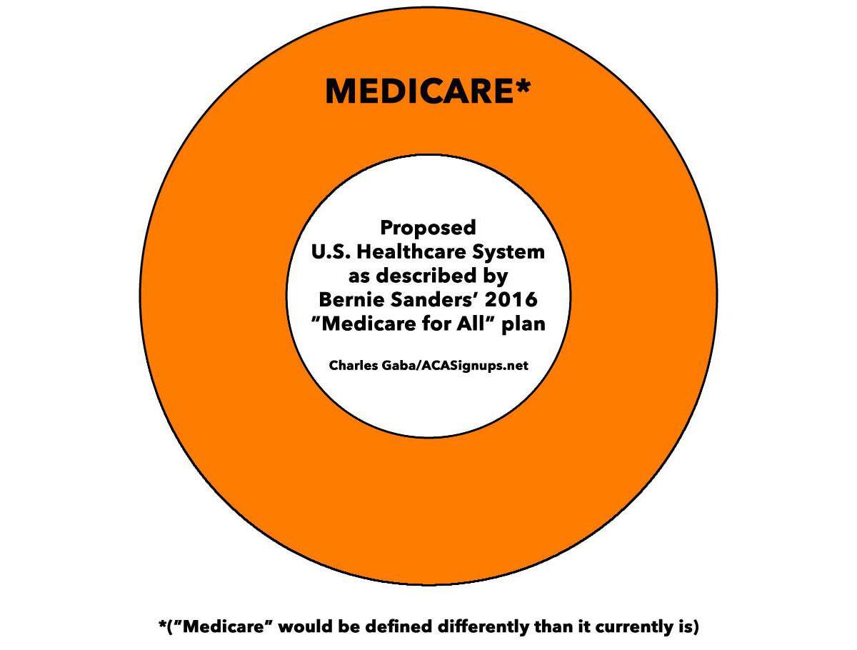 Now, here's what the "Medicare for All" plans envisioned by both John Conyers' HR676 bill (in the House) and Bernie Sanders' "Full Plan" (from the primary campaign last year) would look like if taken literally/at face value: 100% Comprehensive, 100% Actuarial Value, 100% Publicly Funded, $0 Out of Pocket Cost: