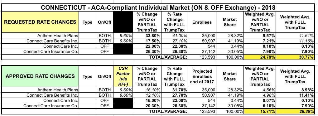 I ran an updated analysis of the requested average rate hikes for Connecticut last month. At the time, the only two carriers operating on the CT exchange next year (Anthem and ConnectiCare) were still noncommittal about actually committing to doing so. Statewide, it looked like the carriers were asking for rate increases averaging around 23.8% if CSR payments were guaranteed or 33.5% if they weren't.