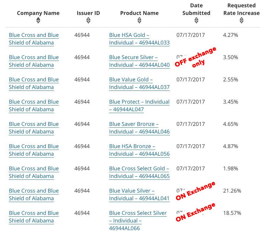 I've also confirmed that Alabama, which we thought was only Silver Loading, is definitley going the full Switcharoo route. There's only one carrier on the individual market in Alabama anyway (no, "Freedom Life" doesn't count), and unlike some carriers, BCBSAL broke out their filings into multiple categories for different metal levels. They have three different Silver filings listed, two available on exchange, on available off exchange only...and it's pretty obvious that they're only loading the CSR cost onto the on-exchange Silver plans, with the off-exchange Silver coming in at the same nominal 3.5% increase which is typical of the other Bronze and Gold plans: