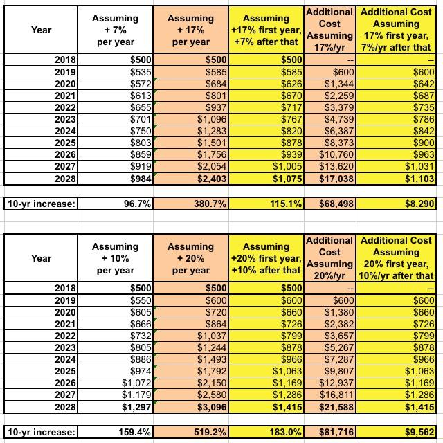 Here's how it would actually look under all three scenarios, assuming you start out with a policy costing $500/month in 2018: