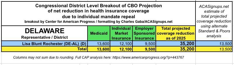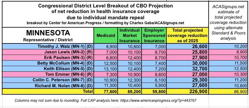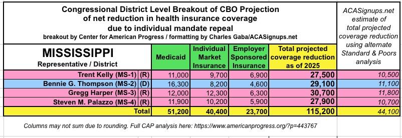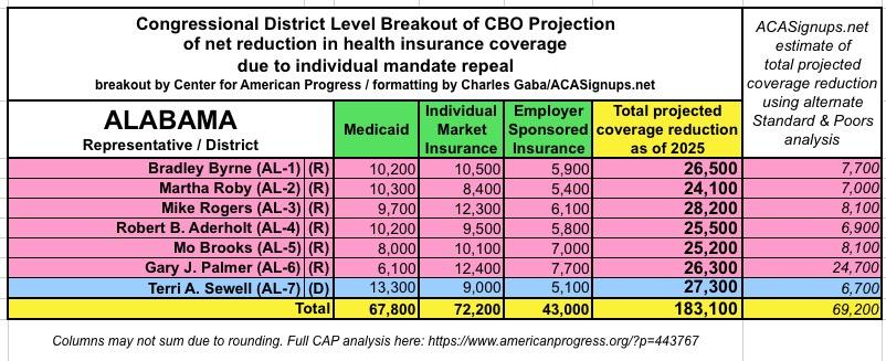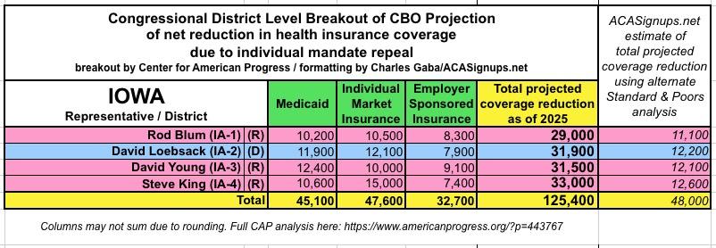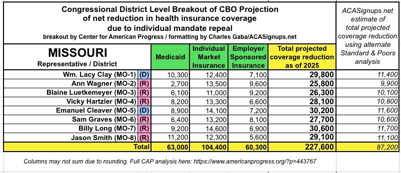 One more thing, however: In addition to the Congressional Budget Office projections, I've also included my own CD-level breakout of the lower coverage loss projections estimated by Standard & Poors. Unlike the CBO's 13 million projection, S&P estimates that only around 5 million people at most would lose coverage over the next several years if the ACA's individual mandate were to be repealed (without other significant changes to the law).