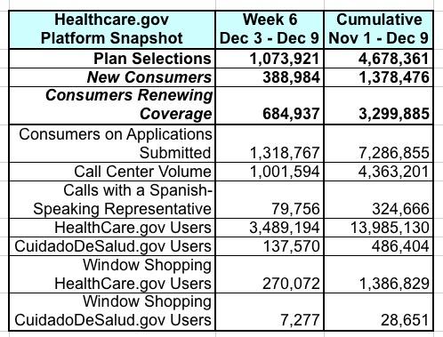 Hmmm...OK, a bit lower than I expected, but not bad. The same comparative week last year (12/04 - 12/10) tallied 1,067,849 QHP selections; this year's total is just barely above that (by about half a percent). Cumulatively, heading into what I assume will be the Big Final Surge®, total HC.gov enrollment is up about 16.5% over last year's 4.02 million.