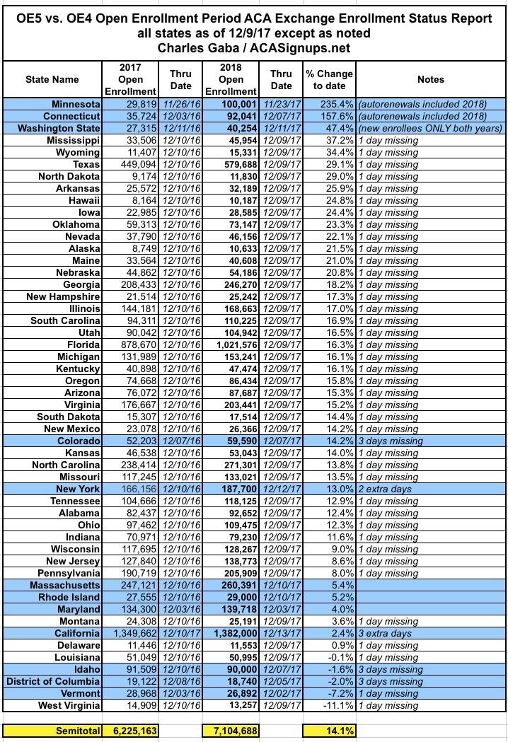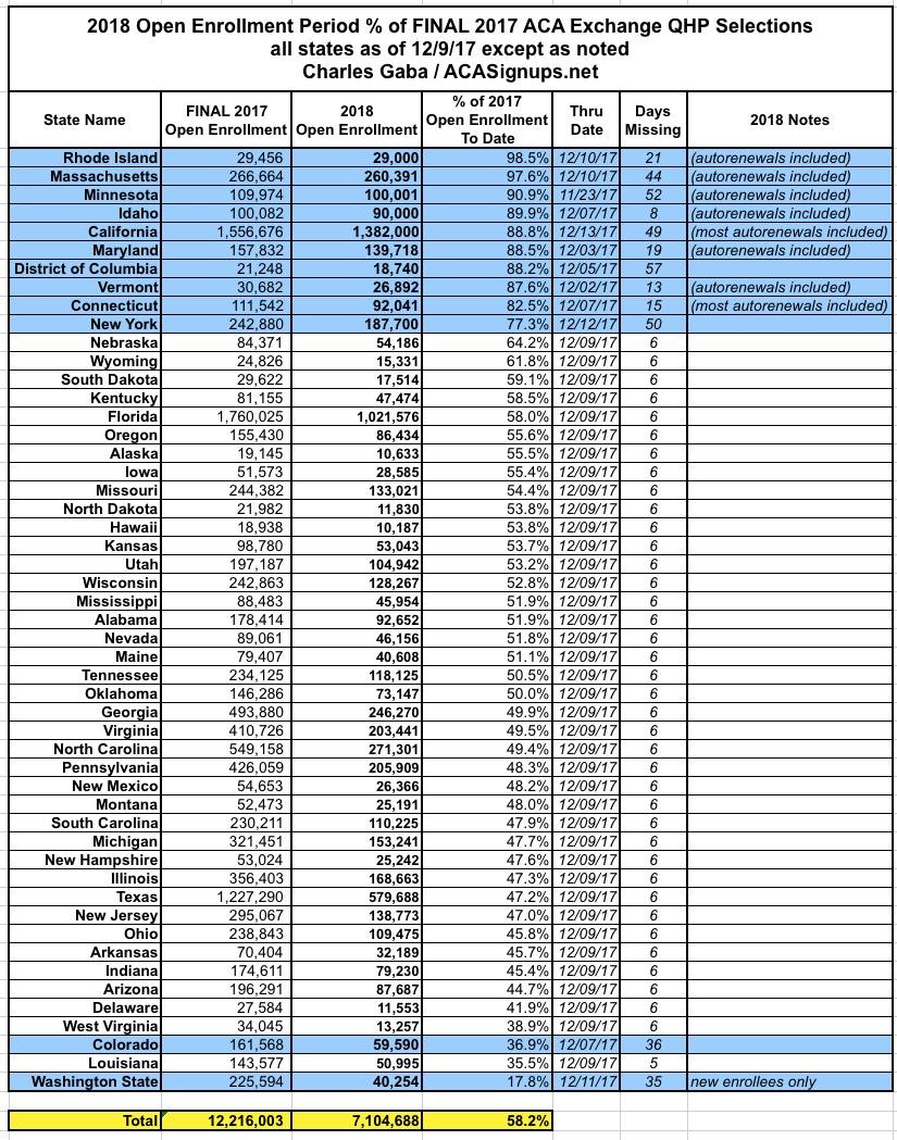 Nationally, confirmed enrollments have reached 7.0 7.1 million people, or 58% of last year's final tally, with the critical final week still missing (and far more than that for some of the SBMs).