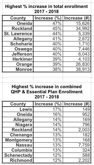 Statewide, enrollment in the Essential Plan and Qualified Health Plans, insurance coverage for New Yorkers not eligible for Medicaid, collectively increased by 9 percent compared with 2017.  Enrollment in these programs increased in 58 New York State counties.