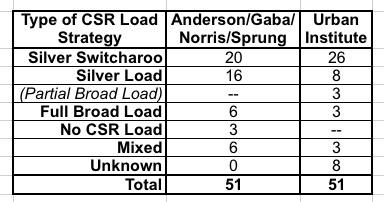 In addition to Urban having 6 more Silver Switch states and half as many Silver Load states, they also added another category which Anderson/Norris/Sprung and I hadn't really considered: "Partial Broad Load" where the CSR load is spread across all metal levels but only for on-exchange policies. Huh. Interesting. I'll have to compare notes to see what they found that we didn't.