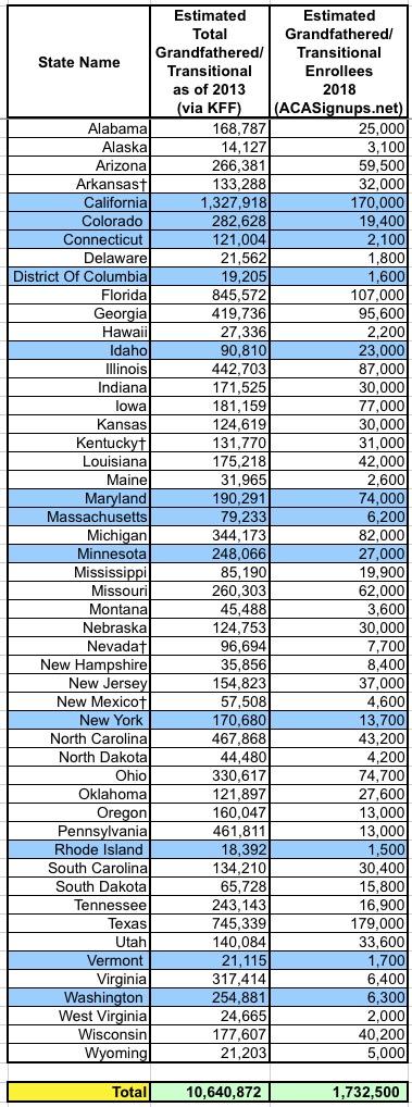 HOWEVER, there's one more twist: While most states took the Obama Administration up on their "If you like your plan you can keep it" transitional plan offer, 17 states did not allow transitional policies to continue. 15 of them cut things off on 12/31/13, while two more (Colorado and Oregon) only allowed a 2-year extension. Given the 40-67% annual attrition rate prior to 2014 (I'm gonna split the difference and assume around 50% on average), that suggests that perhaps 1/3 of those enrolled in 2013 were in grandfathered plans, with the rest transitional. For those states, again in cases where I don't have better data, I'm going to start with the assumption that only 1/3 of the 2013 enrollees were grandfathered in and work from there.
