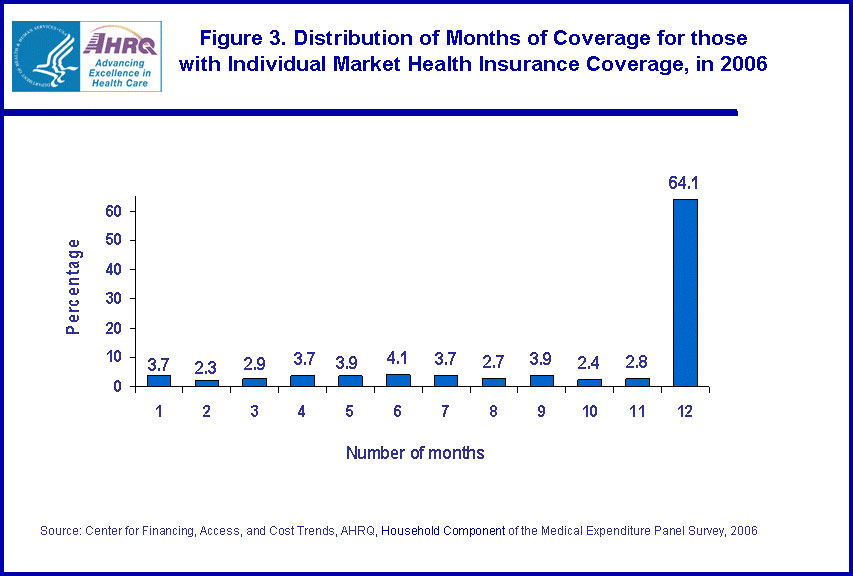 Figure 3 shows the distribution of the number of months of coverage for the 10.9 million individuals with individual health insurance at some point during the year. As seen in figure 3, 64.1 percent of individuals had individual coverage for the full 12 months and the remaining months were evenly distributed from 1 to 11 months.