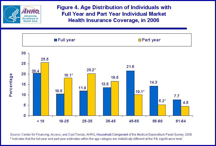 Figure 4 shows the age distribution for persons covered by individual private health insurance for the full year and for part of the year. Individuals with part-year individual coverage were more likely to be between the ages of 19 and 35 than those with full-year individual coverage. Those with full-year coverage were more likely to be between the ages of 46 and 60 than those with part-year coverage. For example, 18.1 percent of those with part-year coverage were 19-25 years old compared to 10.5 percent of those with full year coverage. In contrast, 21.6 percent of those with full year coverage were aged 46-55 compared to 10.1 percent of those with part-year coverage.