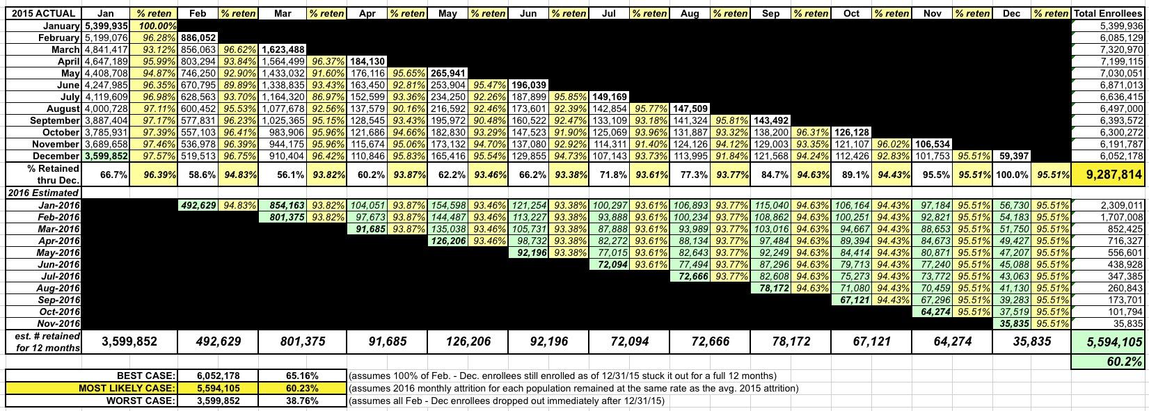 In the spreadsheet below (you'll have to click on it to view the full-size version), I first plugged in the actual enrollment/retention numbers for all 12 months of 2015 from HealthCare.Gov. The problem is that the retention numbers for each month throughout 2016 are still missing, which means I had to make assumptions based on the average monthly retention rate from throughout 2015. For instance, of those who enrolled starting in February, there was an average monthly retention rate of 94.8%, so I assumed that stayed the same for each month in 2016. Of those who started in March, the average was 93.8%, so I used that, and so on.