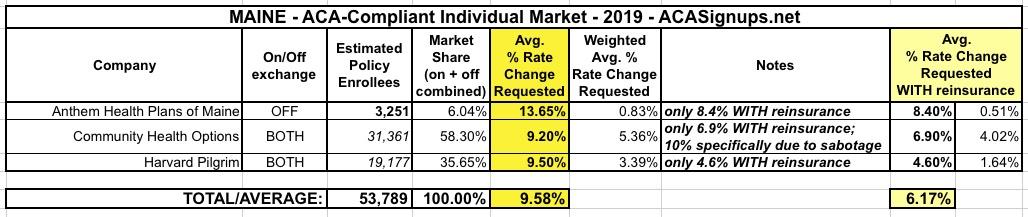 Shout-out to Mitchell Stein for this heads up: The Maine Bureau of Insurance has posted their preliminary 2019 individual and small group policy premium rate filings.