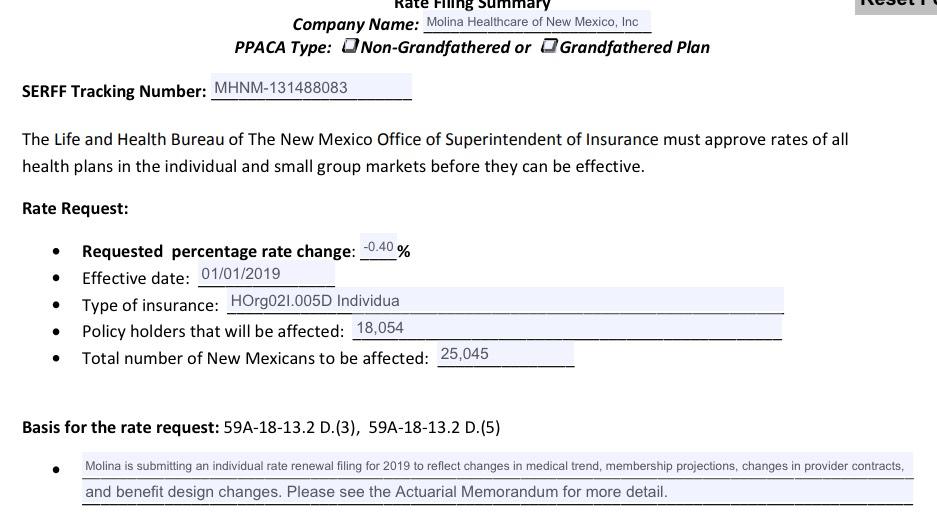 Insurers have filed the following proposed average rate changes, which are now being reviewed by the New Mexico Office of the Superintendent of Insurance: