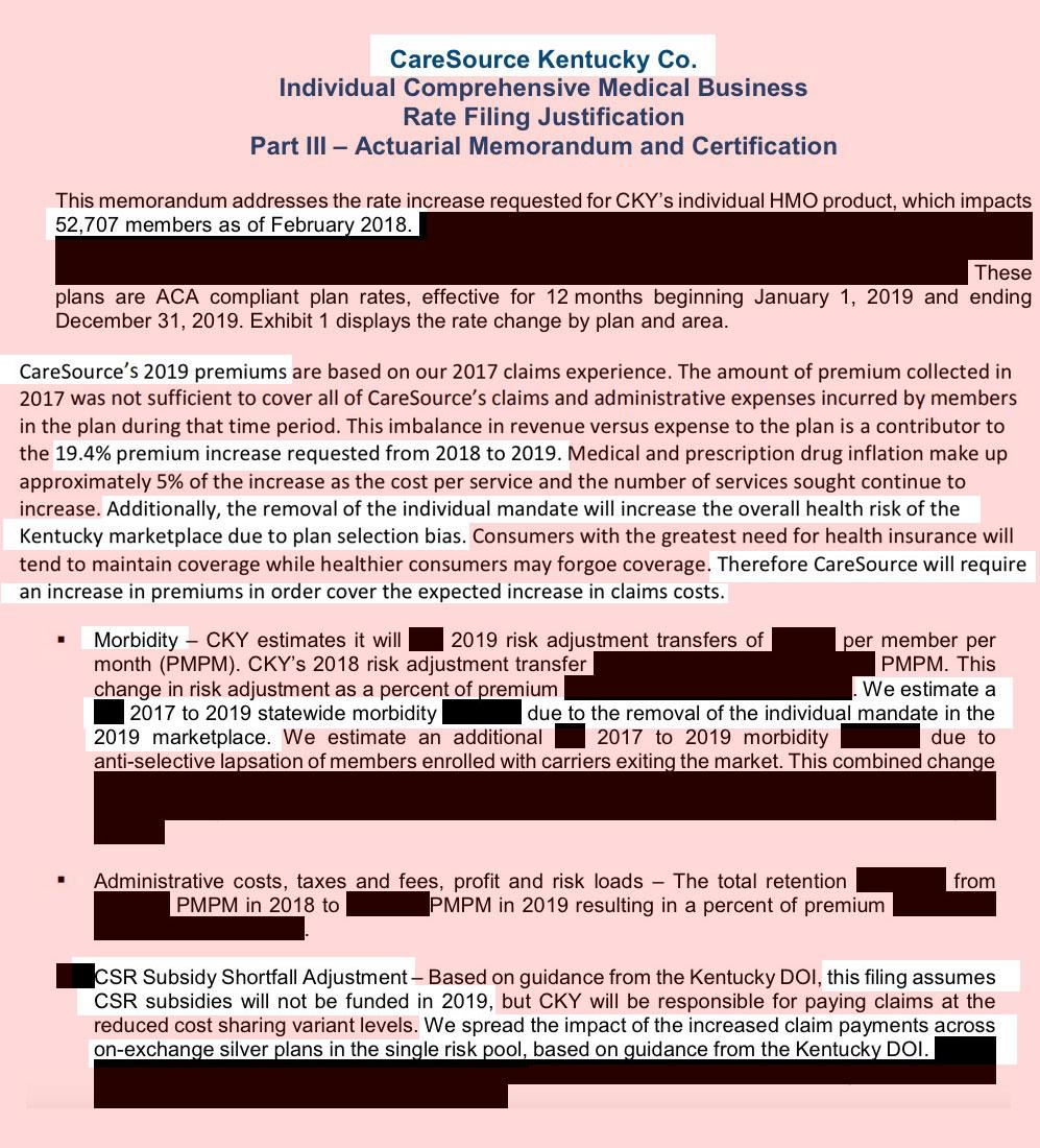 The overall average requested rate increase is around 12.2% between the two. Neither carrier states just how much of their requested increase is due to mandate repeal or #ShortAssPlans (CareSource did list it...but then redacted it from public view). The Urban Institute projected around an 18.7 percentage point impact; 2/3 of that is around 12.5 points, so that's what I'm assuming until further notice.