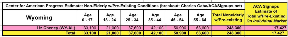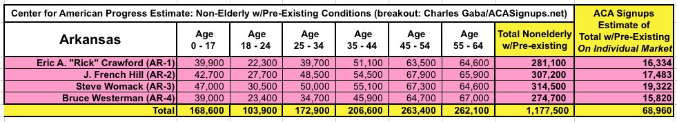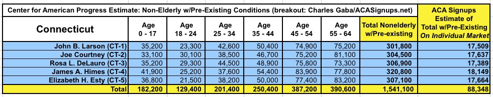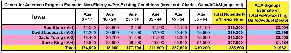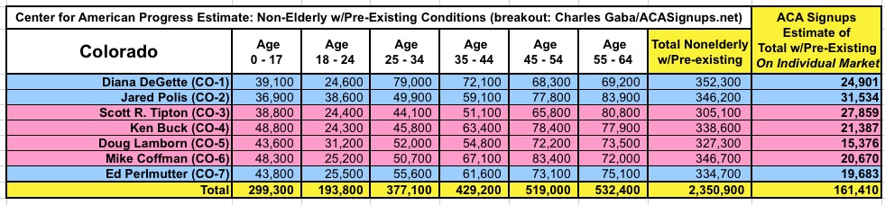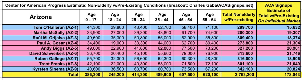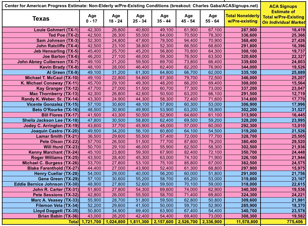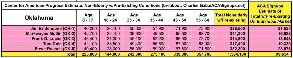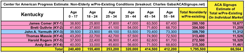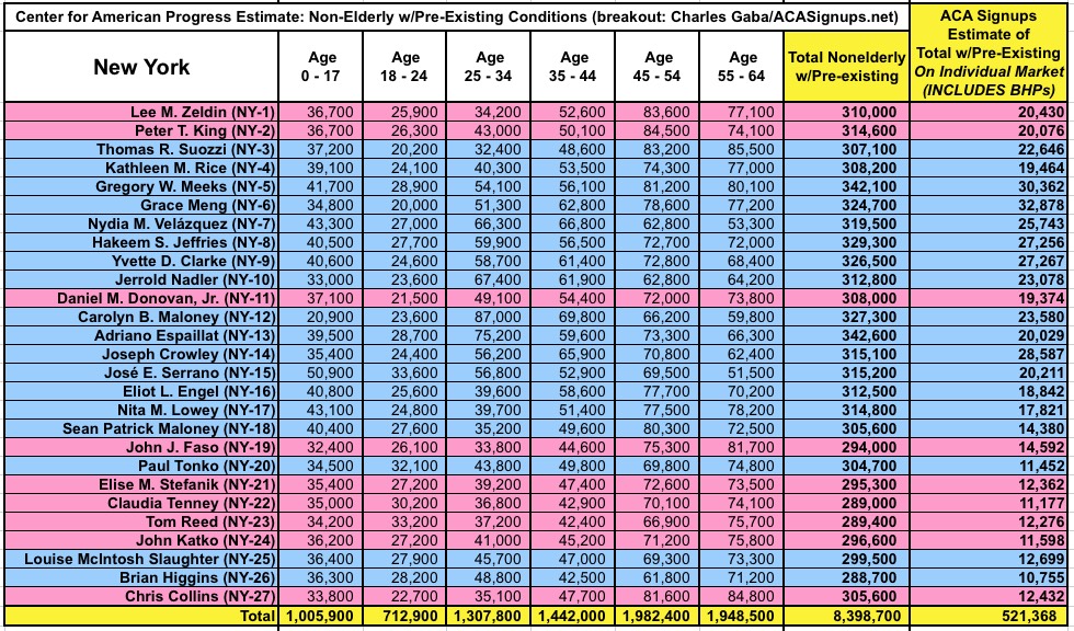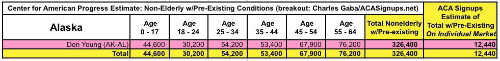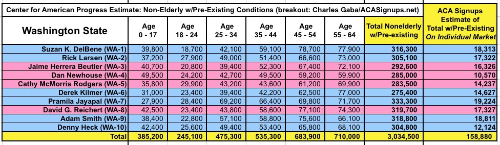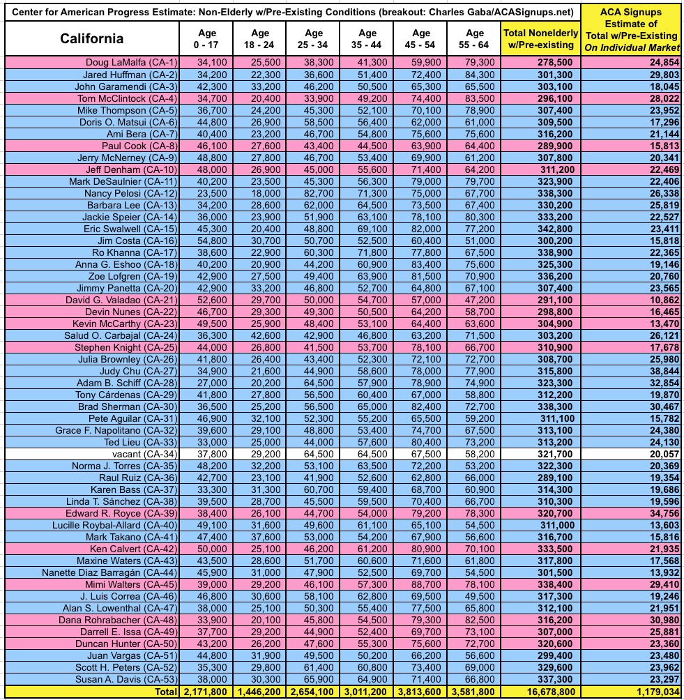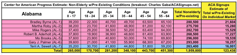 The CAP spreadsheet is extremely handy, and they deserve full credit for crunching the numbers. Unfortunately, it's only available as a single massive spreadsheet, so I've takent the liberty of grouping all 435 CDs together by state into shareable JPG images. I'm also color-coding each CD by party control and, while I'm at it, I'm also plugging in my own estimate of how many people currently on the individual market likely have some sort of pre-existing condition which would likely result in them being charged dramatically higher rates to the point that they likely couldn't afford coverage whatsoever if the Trumpcare 2.0 bill were passed. These estimates are obviously much lower than the total nonelderly population, and are based on: