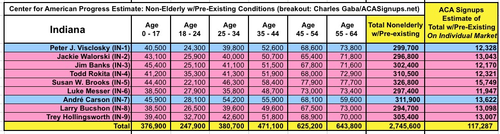 A couple of important caveats: The individual market has shrunk by one or two milion people since a year ago (due in large part to other forms of Trump/GOP sabotage, I should note), so most of the estimates for the last column are likely a bit smaller as well, although those with pre-existing conditions are the least-likely to drop their coverae for that very reason. Also, a good half-dozen Congressional Districts have had special elections over the past year and now have new members of Congress (SC-05, MT-AL, PA-18 and so on) or currently have vacancies not shown below (MI-13, TX-27, etc).