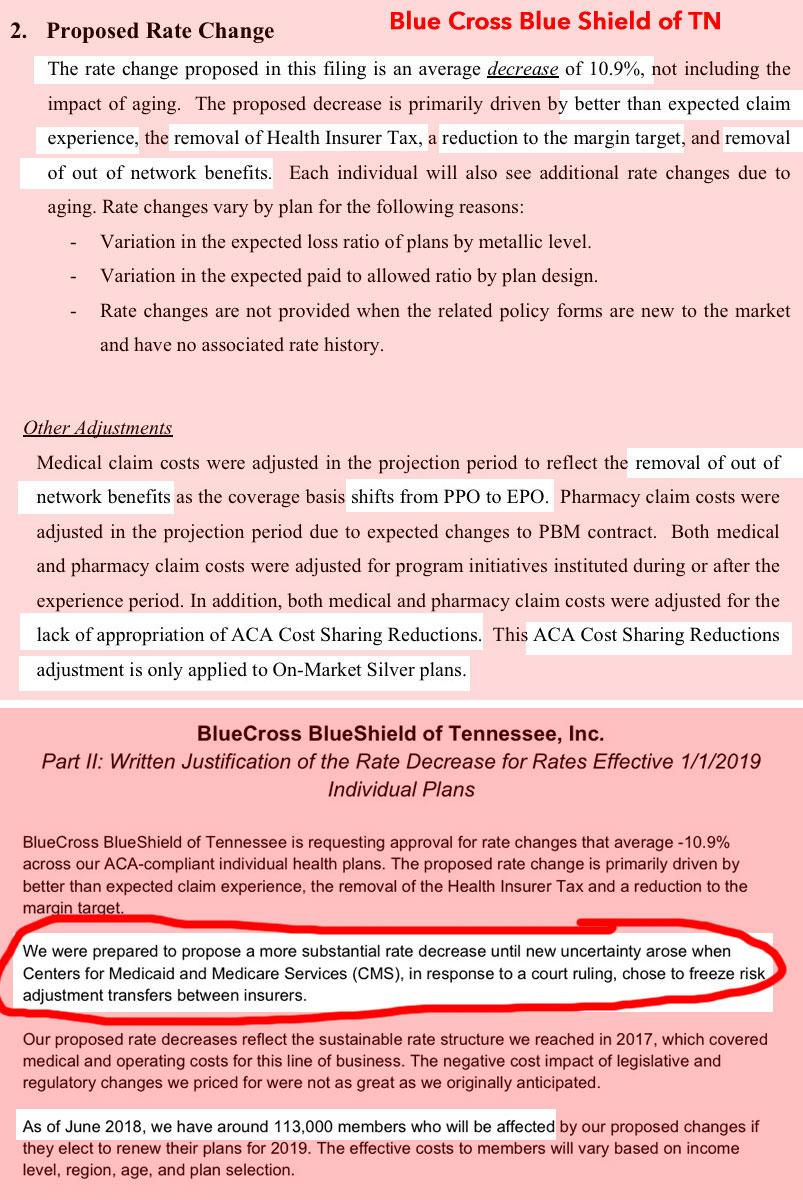 Yes, that's right: Blue Cross Blue Shield of Tennessee, which enrolls over 50% of TN's entire ACA-compliant individual market, was planning on dropping average premiums by a whopping 18% until Trump's CMS Dept. decided to freeze Risk Adjustment transfers for no legitimate reason whatsoever.
