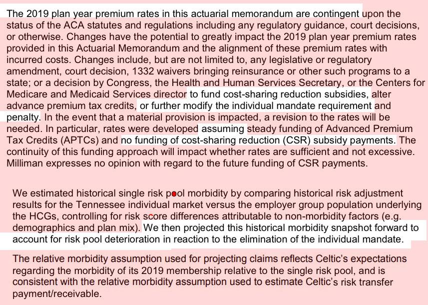 Remember, the RA thing is on top of the other big sabotage factors this year: Repeal of the ACA's individual mandate and the expansion of #ShortAssPlans. Those are, as usual, specifically called out by most of the TN carriers as well. None of them break the impact out specifically, so I'm once again using my standard estimate: 2/3 of what the Urban Institute projected these factors to be. In the case of Tennessee, Urban estimated around 18.1 percentage points would be tacked on, so I'm assuming this to be around 12 points to err on the side of caution.