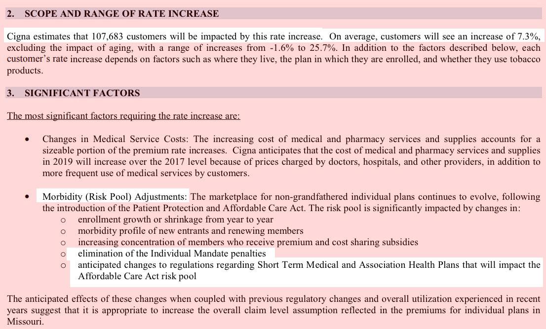 Overall, this means a nominal statewide average increase of just 1.9%, which is good news...except, of course, that there's still the sabotage factors baked into the mix (Cigna, which olds about half the market share, specifically calls out both the mandate repeal and #ShortAssPlans factors in their filing letter below). Taking the Urban Institute's projection of an 18.3% rate increase impact and knocking 1/3 off of that gives an ACA sabotage factor of 12.2 percentage points.