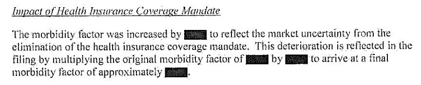 Unfortunately, they've redacted the specific percentages caused by those factors. The Urban Institute pegs it at 19.9%, but I err on the side of caution and only assume 2/3 of that amount, or right around...13%. If accurate, that means Highmark BCBSD would be keeping rates pretty much flat next year if those changes hadn't been made.