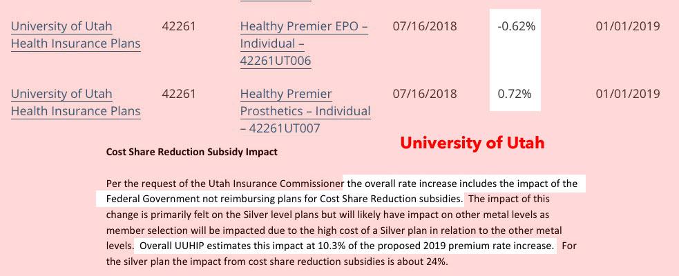 Having said that, there's one interesting extra sabotage factor to consider for the University of Utah rate filing: They note that they've added an extra 10.3% to their 2019 rates specifically tied to last year's Cost Sharing Reduction (CSR) cut-off. I presume they chose not to bake the CSR load into their rates this year, but I don't think Utah went the "mixed load" route so who knows?