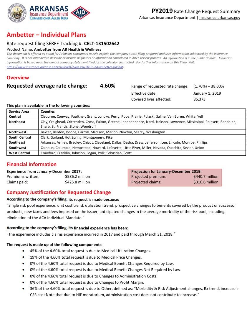 With the deadline for submitting 2019 rate filings having passed a week or so ago, the approved rates from the various state insurance regulators have been popping up left and right. Today I took a look at the Arkansas Insurance Dept. website and sure enough, they've posted the approved filings for all 4 carriers on the individual market (as well as the small group market).