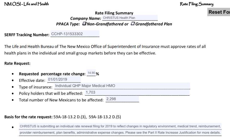 Huh. The surprising thing here isn't that the approved rate changes have dropped--that's pretty common after negotiations between the carriers and the state regulators. What's surprising is how much they've dropped. Plugging the data from the article into the spreadsheet gives a weighted average 0.6% increase, but the article itself claims a 1.0% net drop year over year for unsubsidized enrollees. I'm not sure what accounts for the discrepancy; it could be Presbyterian Health...the article states that they withdrew their proposal to join the exchange...but that still leaves them with over 12,000 off-exchange enrollees. As you can see in the filing screenshot below, they slightly reduced their request from 18.5% to 17.4%. From what I can tell, some of the screenshots come from the requested filings while others are from the approved versions.