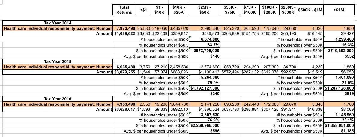 Hmmmm...actually, I believe that's a typo. According to the spreadsheets at the link, it looks to me like the only $1.7 billion in ACA mandate penalty revenue was collected in 2015 (for tax year 2014), from a total of 8.0 million households. Of that, around 6.7 million households earned less than $50,000, or around 84%.