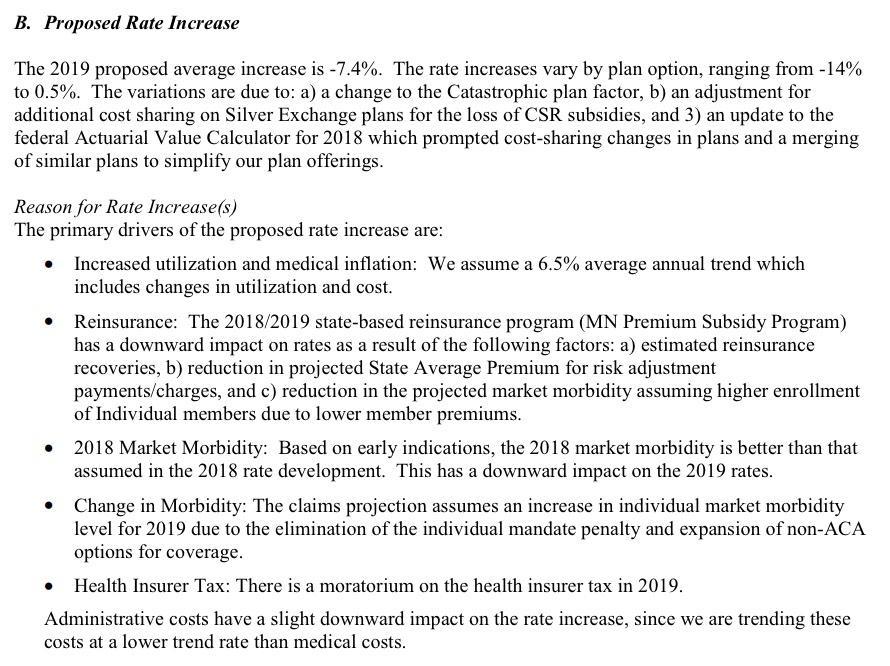 Minnesota, currently entering their second year of their official reinsurance waiver program to help keep unsubsidized premiums down, announced their preliminary 2019 rate hikes way back in June. At the time, the carriers were looking at roughly an 8% average reduction in rates next year...although they would be dropping prices by more like 15% if not for the ACA's individual mandate being repealed and the expansion of #ShortAssPlans.