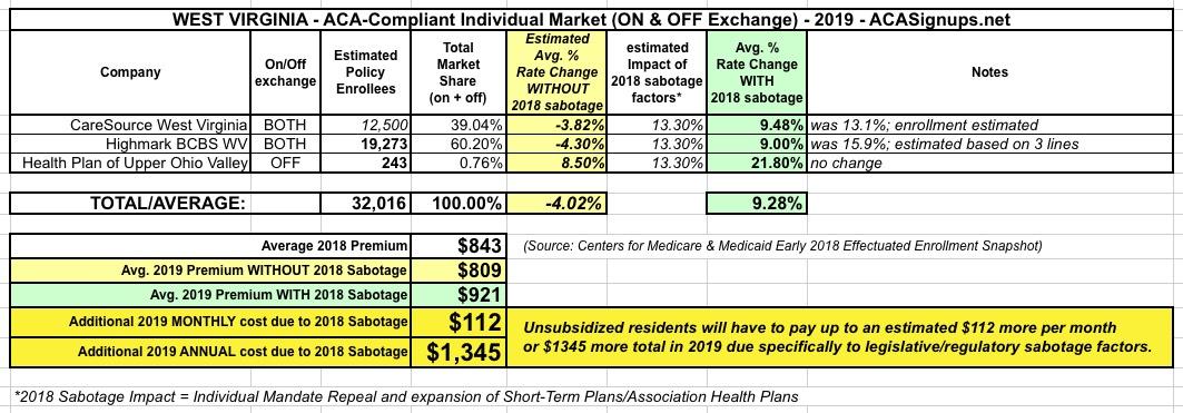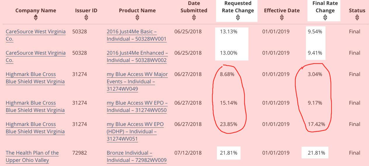 West Virginia's requested average rate increase was among the highest in the country for 2019--a weighted average of around 14.9%.