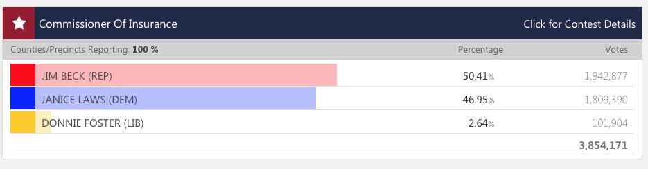 Republican and former deputy insurance commissioner Jim Beck had a slight lead over Democrat and insurance agent Janice Laws in the state election to replace Georgia Insurance Commissioner Ralph Hudgens, who decided not to seek re-election this year, opening up the playing field for the state’s top insurance post for the first time since 2010.