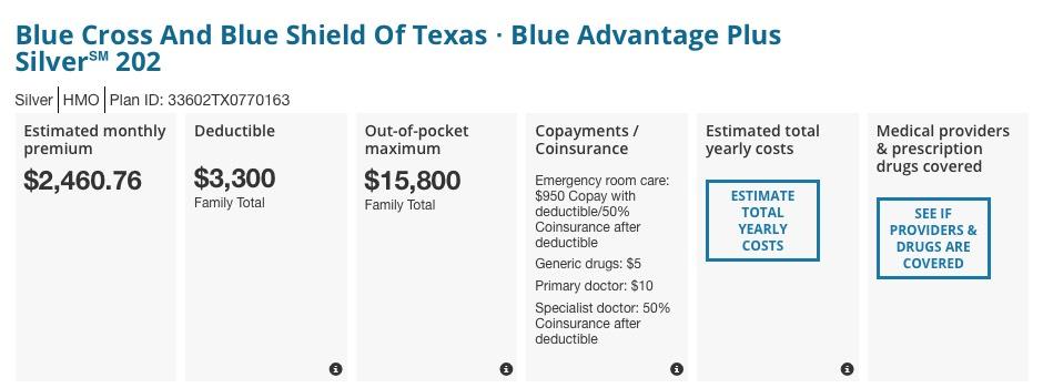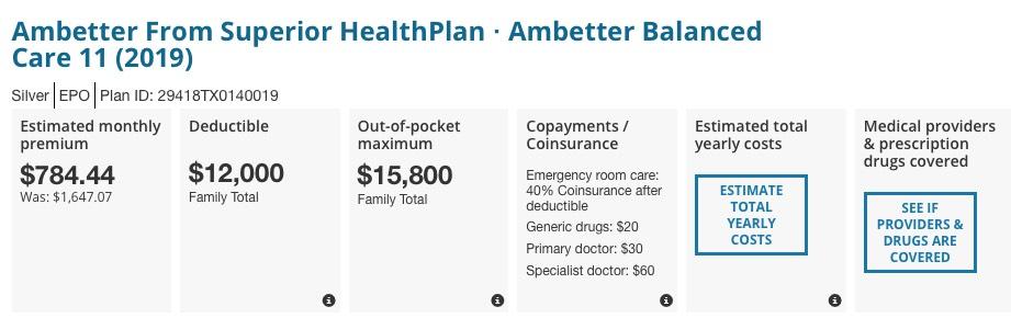 This article is supposed to be sympathetic towards the Maldonados, and most of it absolutely is--they are very much caught in the "Unsubsidized Gap" of people who earn more than 400% FPL and therefore don't qualify for financial assistance. I did a little checking for 2019 using the information provided in the article (he and his wife are 49 & 48, two teenage children, living in Dallas, Texas). Here's what one of the two Blue Cross Blue Shield Silver ACA policies would cost them for next year (the other BCBS Silver plan was close to this):