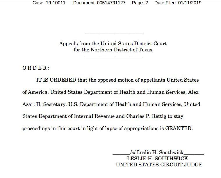 Speaking of litigation affected by the shutdown: The 5th Circuit has agreed to stay the Texas Obamacare challenge (the one where a judge declared the entire law invalid)