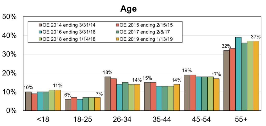 Here's a chart showing the age demographics of enrollees each year. Not a whole lot of movement for the most part, though the 26-34 year old band has dropped a bit while the 55+ band has increased, which isn't a good thing from a risk pool POV.