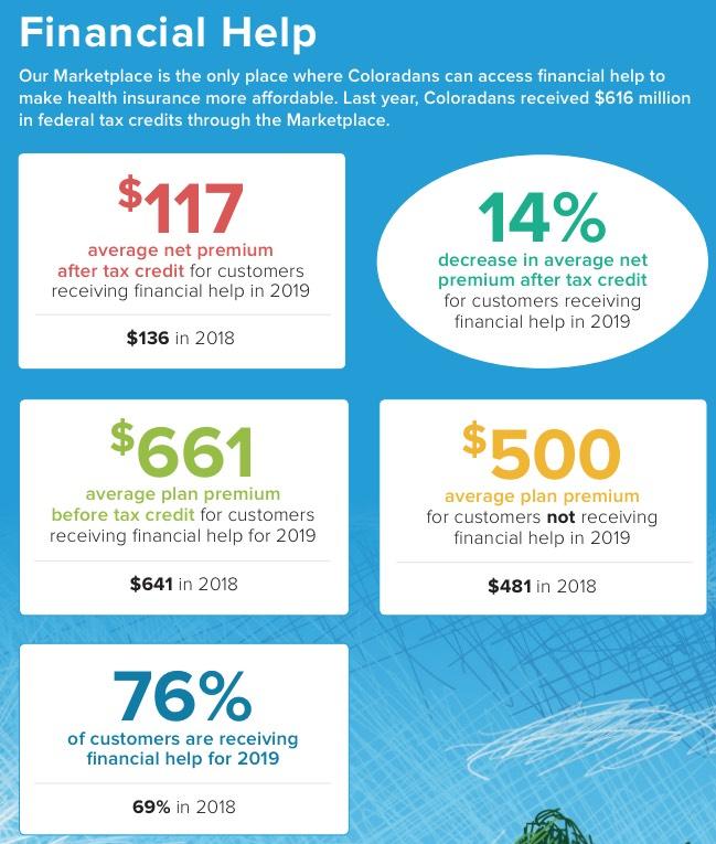DENVER – Coloradans who get financial help buying health insurance through Connect for Health Colorado® are paying an average 14 percent less in “net premium” – what they pay after assistance – compared to the average net premium in 2018, according to data released today.