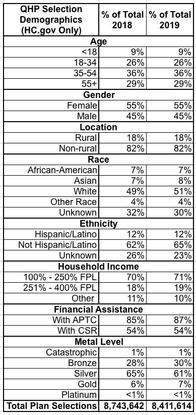 [8] Note that Table 2 in this report is not directly comparable to Table 2 in the previous 2018 report. SBEs do not collect and report data across all of the demographic factors that HealthCare.gov states report. In the 2018 report, Table 2 reported on the demographic and plan characteristic factors that are consistently reported across all states for both HealthCare.gov states and SBEs. The 2018 report included a separate table for the demographic factors that are limited to Healthcare.gov. This year, Table 2 consolidates those tables and reports HealthCare.gov states only. The demographic and plan characteristic data for SBEs is available in the PUFs.