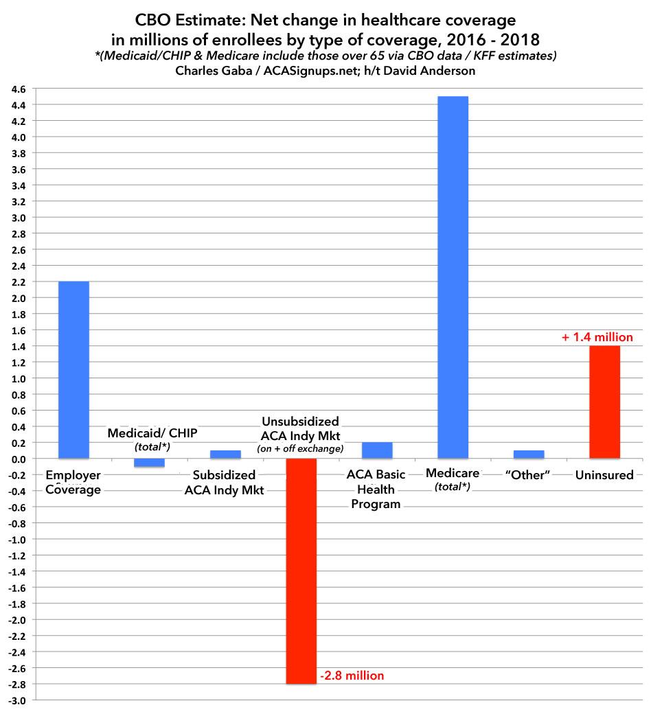 Dave Anderson gave me the idea to post these numbers in a graph to make the contrast more obvious. Since the CBO report only includes people under 65, I've replaced the Medicaid/CHIP and Medicare columns with the hard numbers from CBO and Kaiser Family Foundation data to paint a more complete picture. This still isn't quite right since some people over 65 also have Employer or Individual Market coverage, but it should be pretty close (only around 100,000 ACA exchange enrollees are over 65 each year anyway, so slight variances there wouldn't move the needle either way):