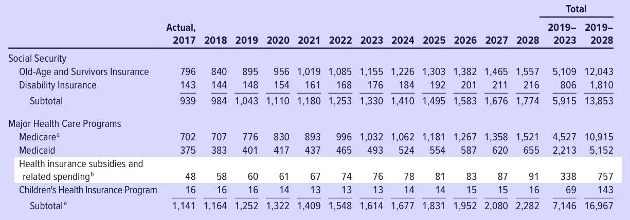 Health Insurance Subsidies and Related Spending. Outlays for health insurance subsidies and related spending are estimated to increase by $10 billion, or 21 percent, in 2018.8 That jump mostly stems from an average increase of 34 percent in premiums for the second-lowest-cost “silver” plan in health insurance marketplaces established under the Affordable Care Act. (Those premiums are the benchmark for determining subsidies for plans obtained through the marketplaces.) Over the 2019–2028 period, the average growth in spending is projected to lessen considerably, to just under 5 percent per year, as per-beneficiary spending rises with the costs of providing medical care. CBO estimates that, under current law, outlays for health insurance subsidies and related spending would rise by about 60 percent over the projection period, increasing from $58 billion in 2018 to $91 billion by 2028.