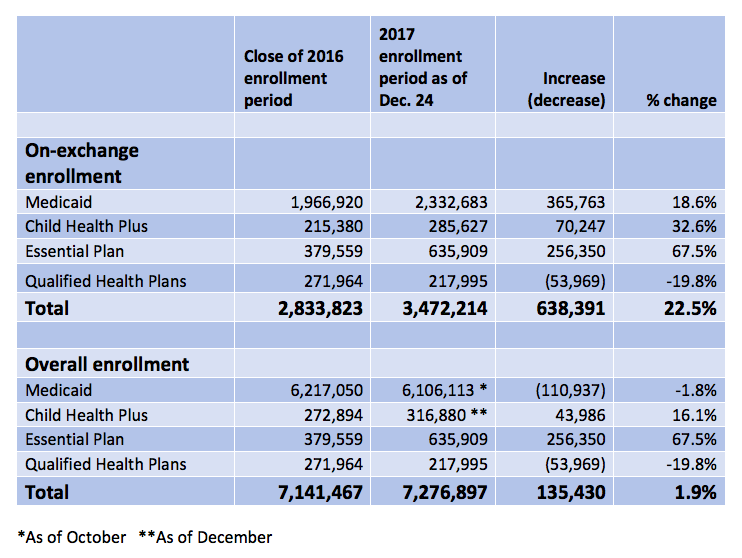 ...The reason for the discrepancy is that DOH’s release counted only sign-ups through the exchange, which handles less than half of the enrollment for the relevant programs. When off-exchange enrollment is included, the picture changes dramatically, as shown in the chart below.