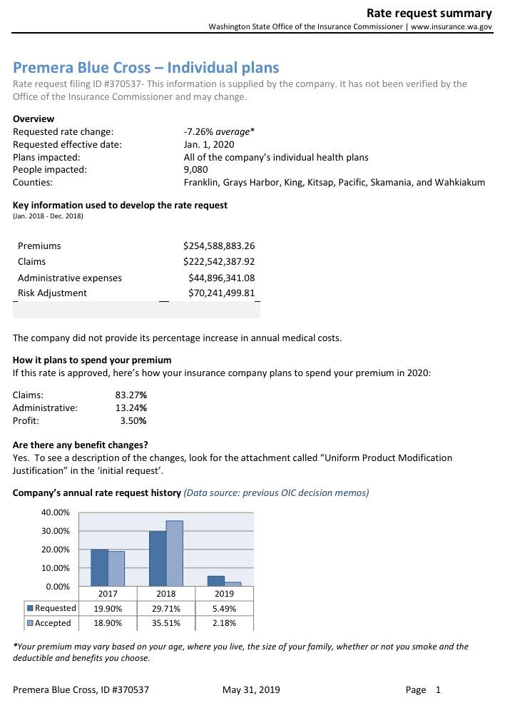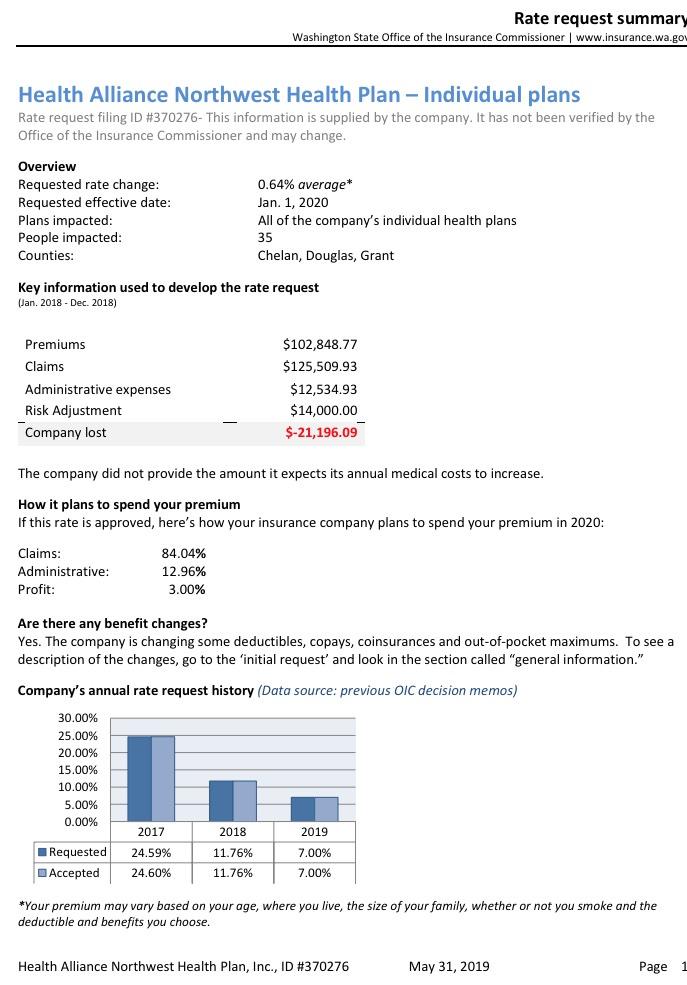 Washington State: PRELIMINARY 2020 ACA Exchange Premium Rate Changes: 1.0% increase