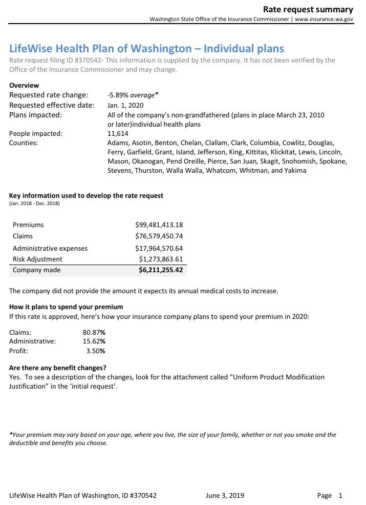 When I plug the hard numbers in from all of the insurers based on the rate filing summaries, I get a slightly higher weighted average of 1.43% instead of 0.96%, but that's pretty nominal and could be accounted for by several factors. Also, the grand total enrollment comes in at just 214,000 instead of the 248,000 noted in the press release; I'm not sure where the other 34,000 enrollees are...perhaps they're the last remnants of grandfathered plan enrollees? I did see one 2020 filing listing 6,300 enrollees in grandfathered LifeWise policies; it's possible that the other 28,000 or so are in grandfathered policies which aren't being renewed.