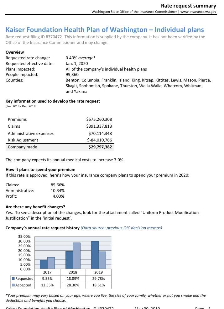 “Despite the Trump administration’s effort over the last two years to sabotage the Affordable Care Act, this year’s filings are evidence that our full adoption of the law and the steps we’ve taken to defend and preserve it are stabilizing our market,” said Insurance Commissioner Mike Kreidler. “We have more work to do to lower the cost of health care and to help lower out-of-pocket costs, but these proposed rates are welcome news.”
